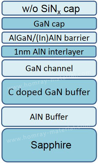 As the leading manufacturer and supplier of GaN (Gallium Nitride) Epi (Epitaxial) wafer and GaN-On-Sapphire Epi Wafer For HEMT/RF HEMT application. Homray Material Technology offers 2inch~6inch GaN (Gallium Nitride) on Sapphire Epi (Epitaxial) wafer for microwave electronic applications. C-face Sapphire substrate thickess is 430um,520um,650um,or 1000~1300um. GaN (Gallium Nitride) buffer layer normal is 2~4um. Homray Material Technology can customized structure and parameters accroding to customers requirement.