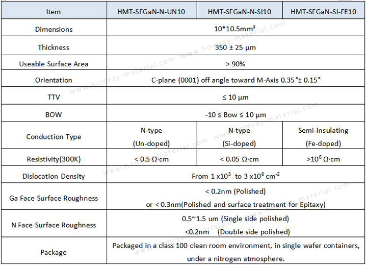苏州恒迈瑞材料科技作为氮化镓衬底晶片(GaN氮化镓晶片)的专业生产厂家,可提供方形尺寸为10*10.5mm2的氮化镓自支撑衬底片,导电类型主要分为N型非掺杂,N型硅掺杂和半绝缘型铁掺杂。GaN自支撑衬底TTV≤10um,包装方式为单个晶圆盒或Cassette盒。作为第三代半导体材料的GaN氮化镓优势凸显,由于禁带宽度大、导热率高,GaN材料制作的器件可在200℃以上的高温下工作,能够承载更高的能量密度,可靠性更高;其较大的禁带宽度和绝缘破坏电场,使得器件导通电阻减少,有利于提升器件整体的能效;且电子饱和速度快,以及较高的载流子迁移率,可让器件高速地工作。
