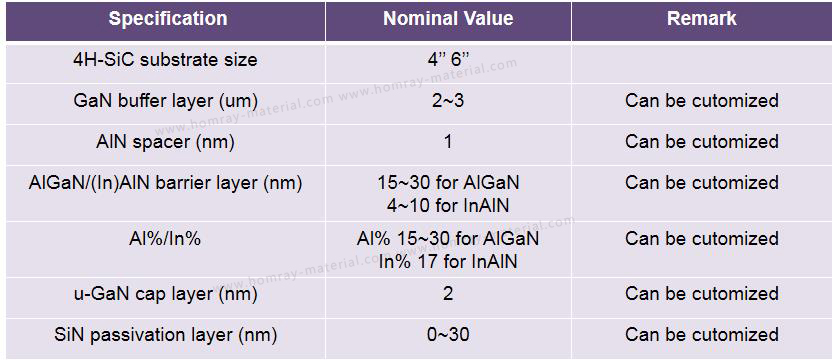 Homray Material Technology manufactures GaN-on-SiC and GaN-on-Si Epitaxial wafer and supplies these GaN Epi Wafers to integrated device manufacturers to create high performance power and RF devices.Our GaN-on-SiC Epi Wafer can be divided into Power HMET structure and RF HEMT structure. 4 inch and 6 inch both available in HMT and each layer structure can be customized.