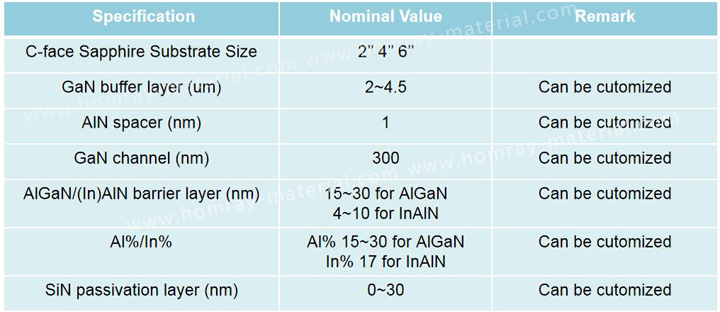 As the leading manufacturer and supplier of GaN (Gallium Nitride) Epi (Epitaxial) wafer and GaN-On-Sapphire Epi Wafer For HEMT/RF HEMT application. Homray Material Technology offers 2inch~6inch GaN (Gallium Nitride) on Sapphire Epi (Epitaxial) wafer for microwave electronic applications. C-face Sapphire substrate thickess is 430um,520um,650um,or 1000~1300um. GaN (Gallium Nitride) buffer layer normal is 2~4um. Homray Material Technology can customized structure and parameters accroding to customers requirement.